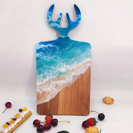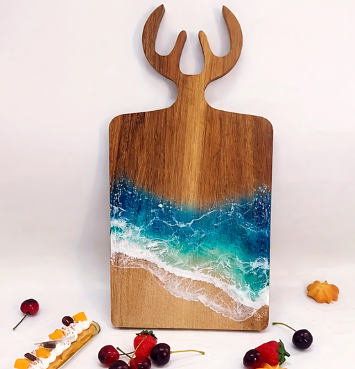 لوح جبن مستطيل مع مقبض على شكل قرن لفن الراتنج لوح أكاسيا الحجم - 25*15 سم حجم القرن - 10*8 سم